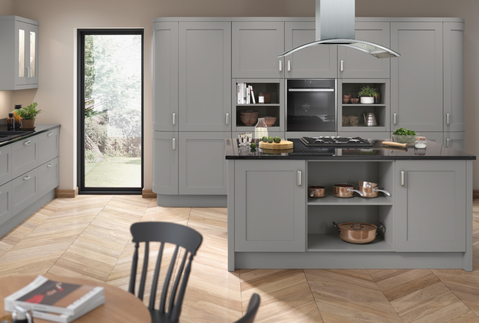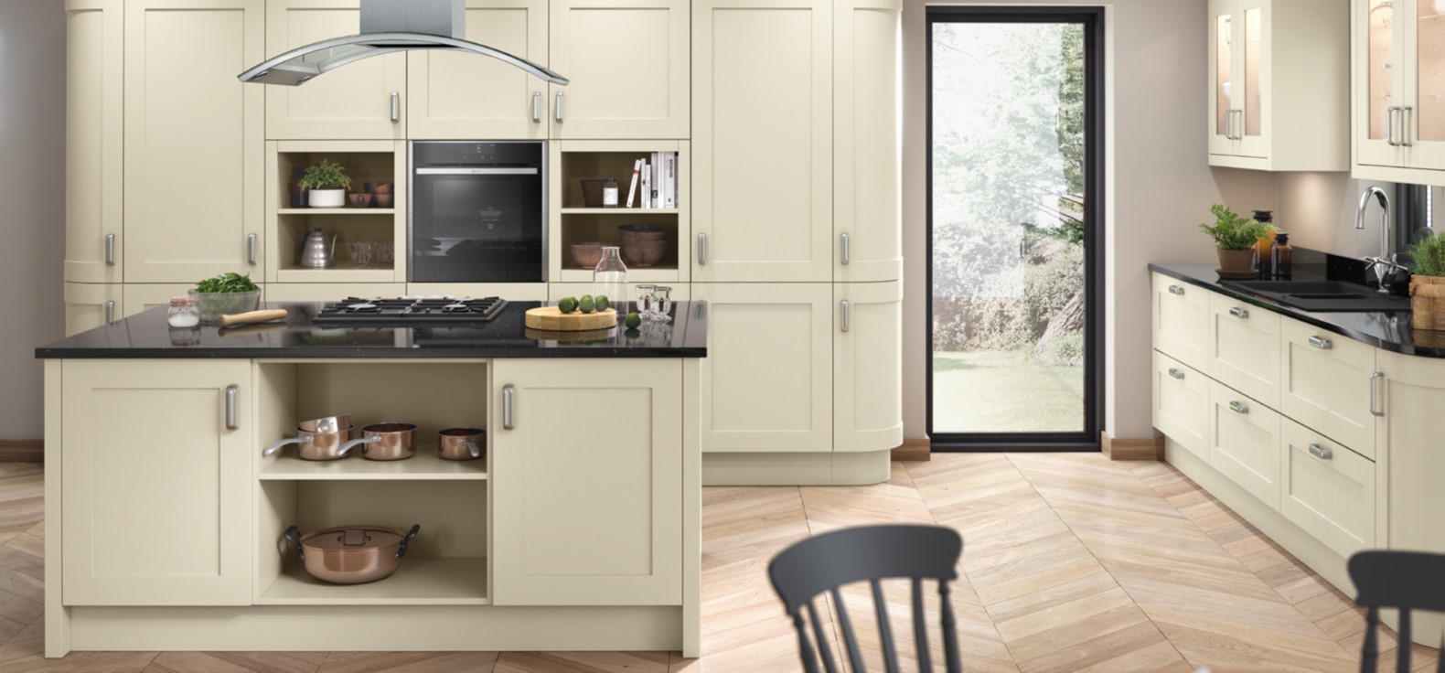 The warm tone of cashmere makes a stunning impact in a matt handleless kitchen.